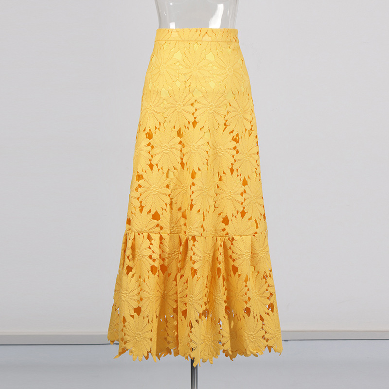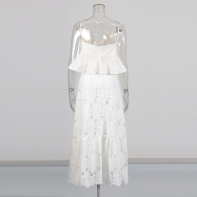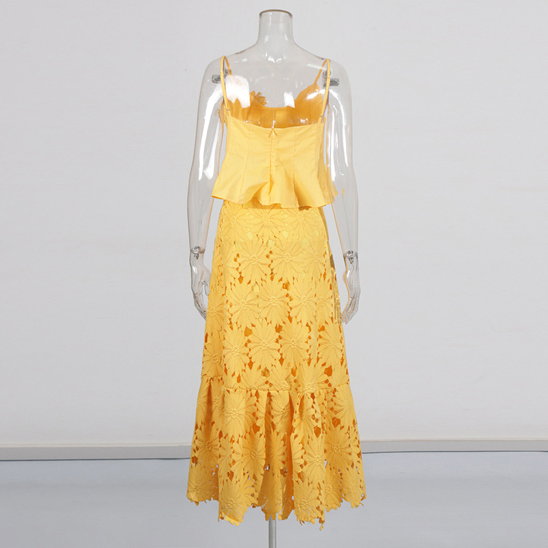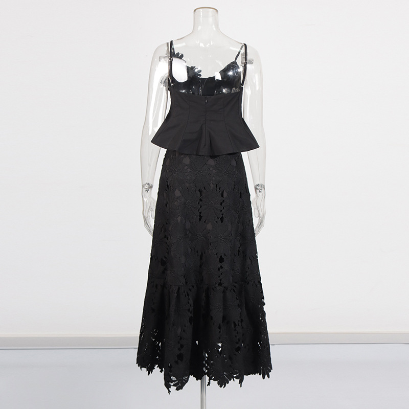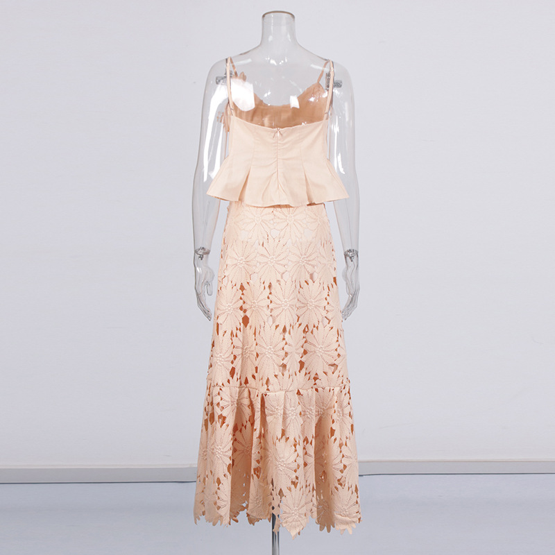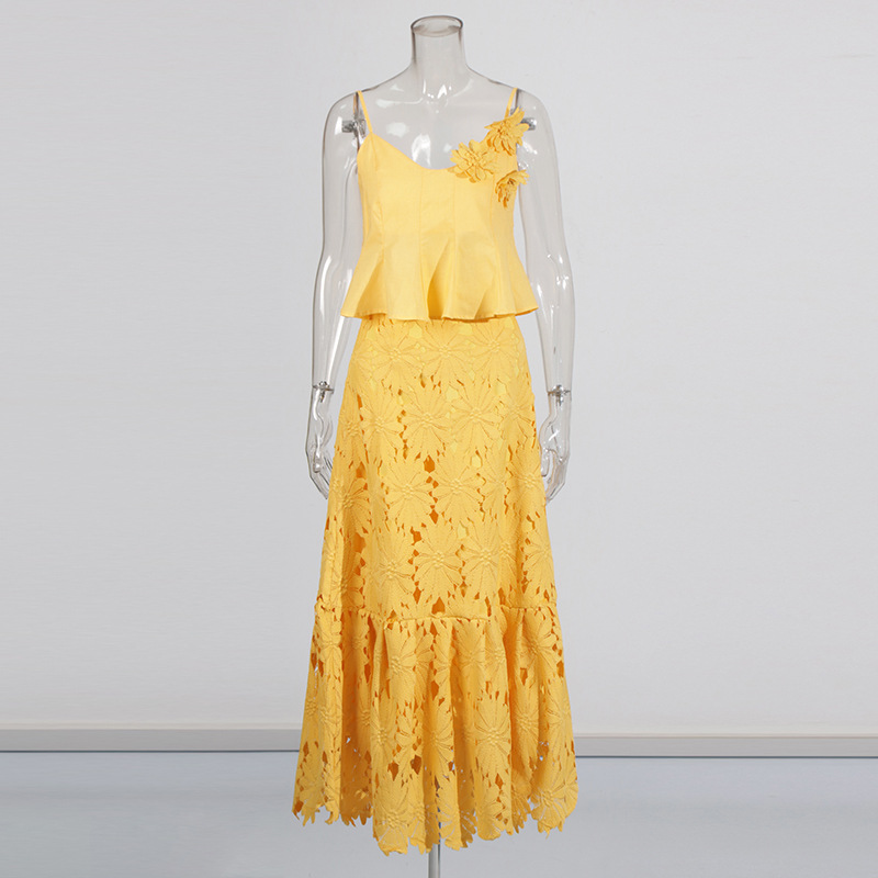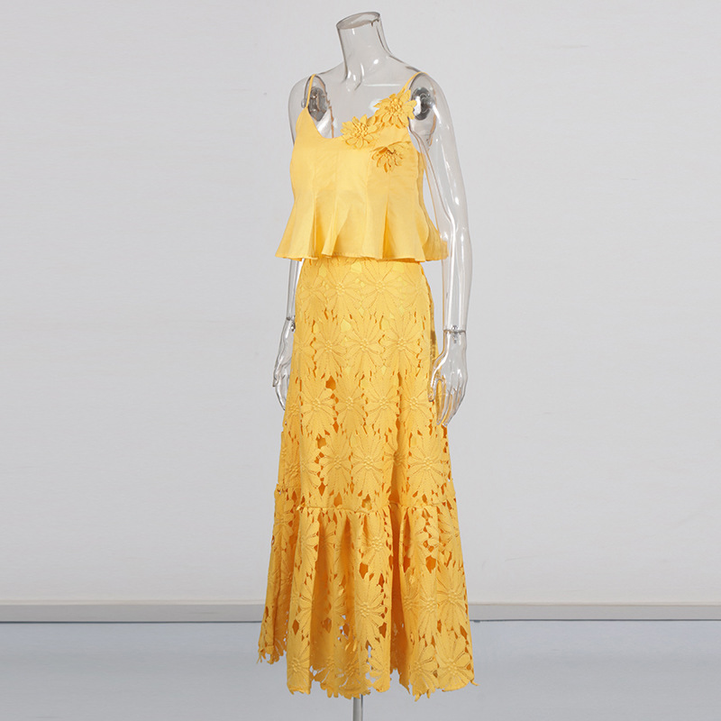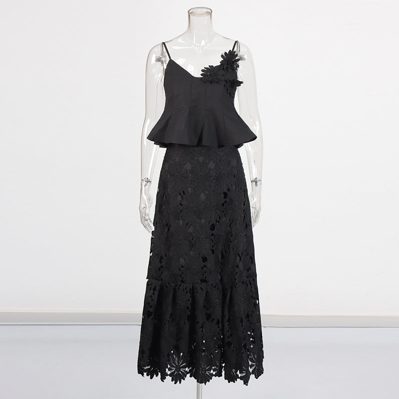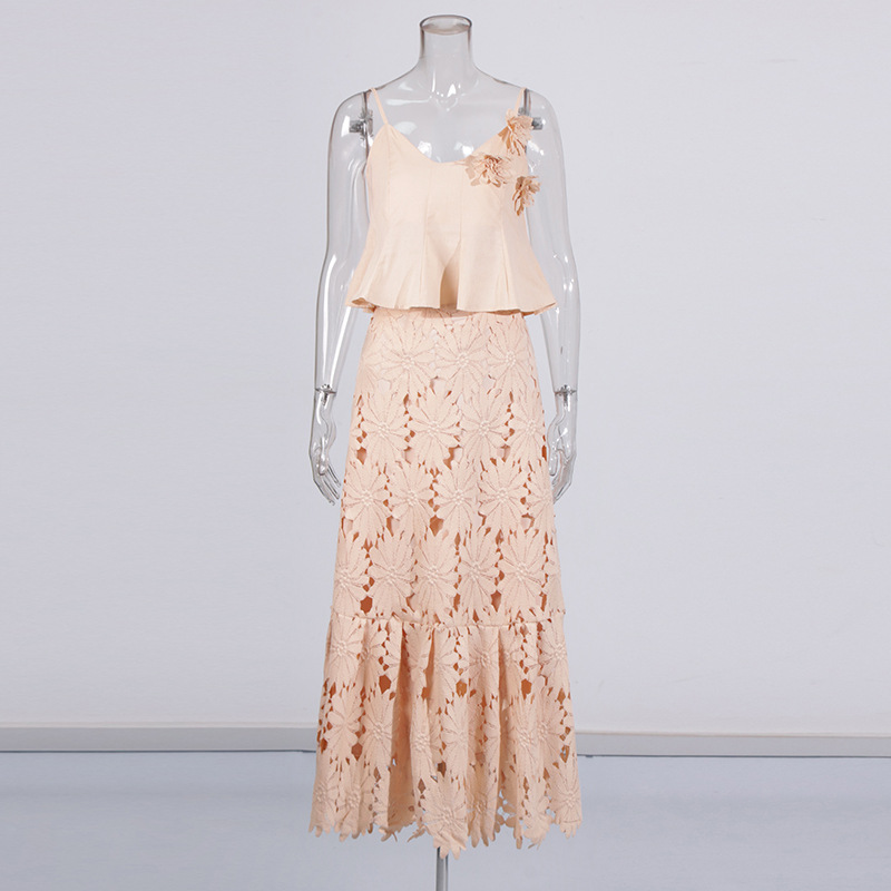 Boho 3D Flower Cami Peplum Top + Cutout Lace Tiered Maxi Skirt Set