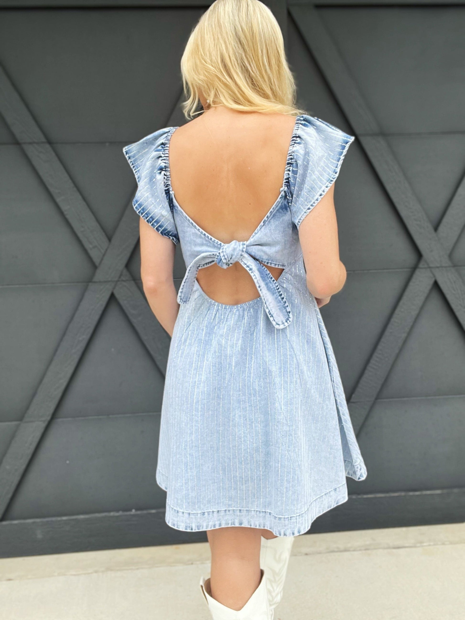 Light Wash Ruffle Embellished Stripe Flare Denim Dress