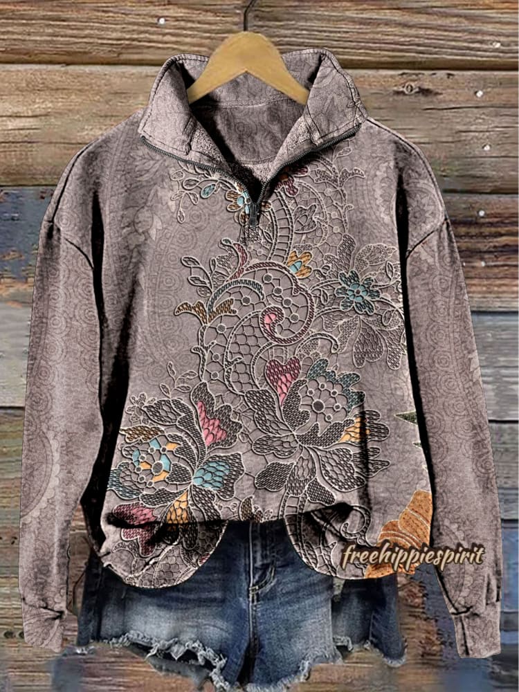 Vintage Floral Art Print Casual Long Sleeve Zip Sweatshirt