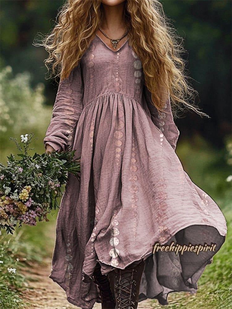 Women's Retro Art Pattern Print V Neck Pocket Cotton Dress