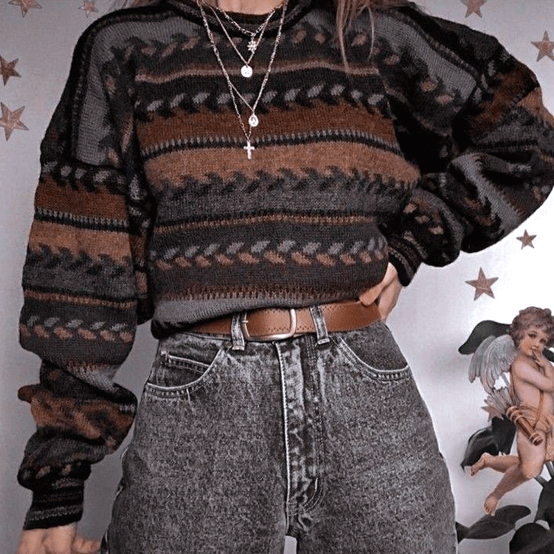 Women's Vintage Geometric Pattern Striped Ethnic Style Print Round Neck Oversize Deep Coffee Color Sweatshirt