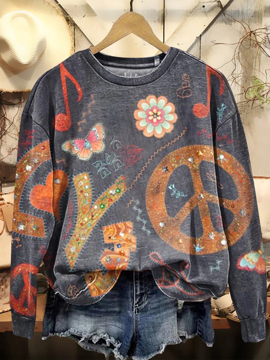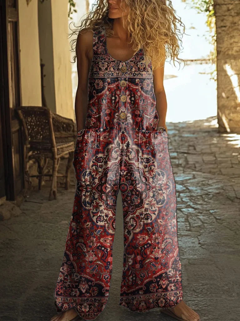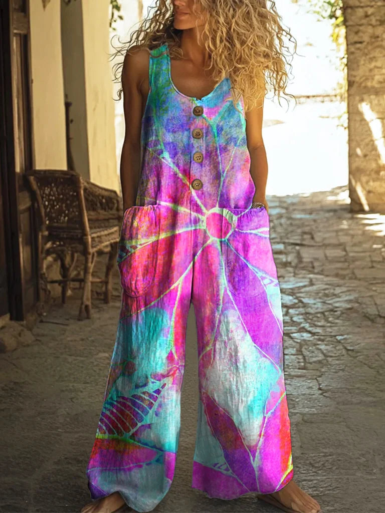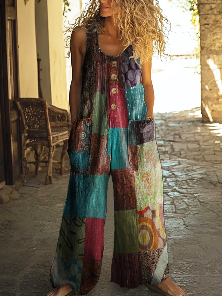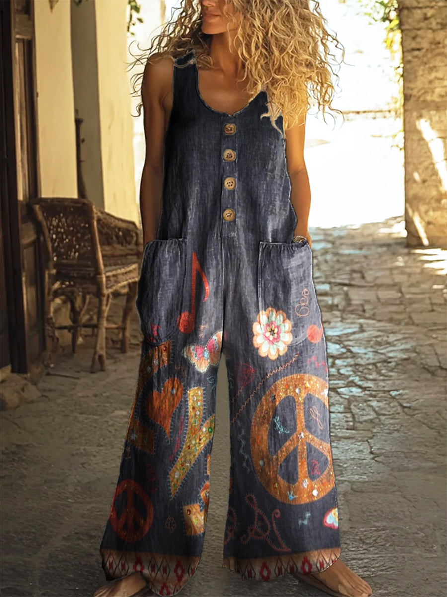 Women's Vintage Hippie Peace Love Print Casual 100% Cotton Wide Leg Jumpsuit