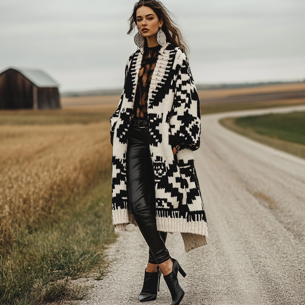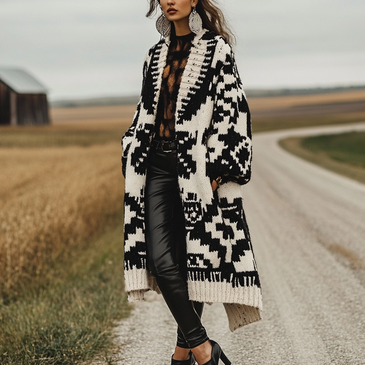 Women's Vintage Western Aztec Print Patterns Long Sleeved Woolen Coat Jacket